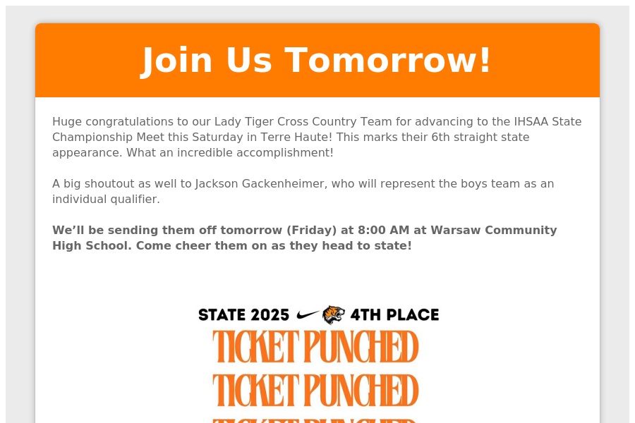 WARSAW, IN - On Saturday, November 1st the Warsaw Lady Tigers Cross Country Team and Senior Jackson Gackenheimer will toe the line against the state’s best runners in the 2025 IHSAA State Cross